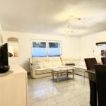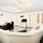 Das Apartment im Souterrain links verfügt über ein Wohnzimmer mit Küchenbereich, ein Schlafzimmer, ein Bad und ein Grillplatz: