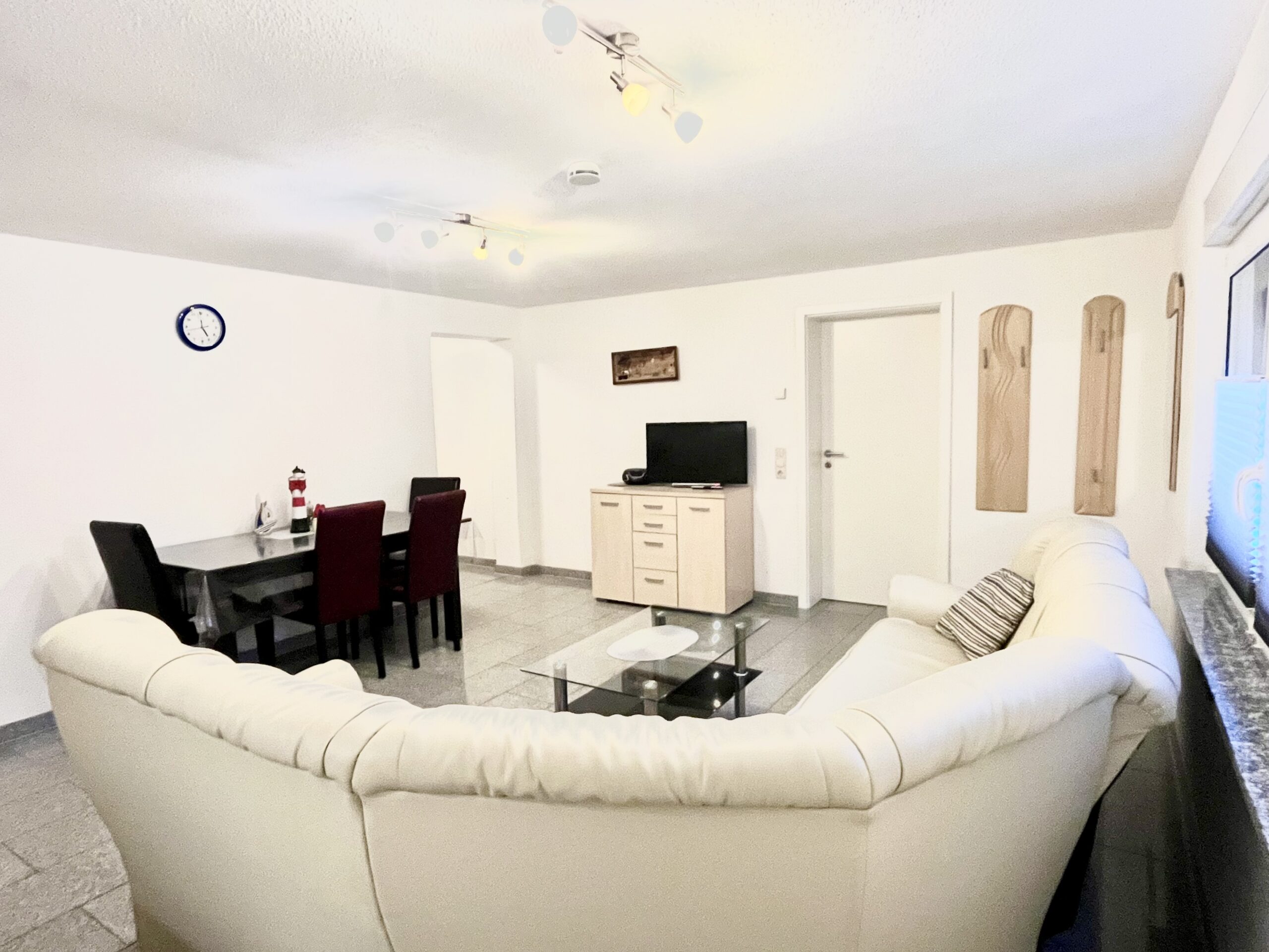 Das Apartment im Souterrain links verfügt über ein Wohnzimmer mit Küchenbereich, ein Schlafzimmer, ein Bad und ein Grillplatz: